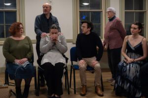 A male and two female actors, one knitting, sit looking to their right, with a second male standing behind watching them